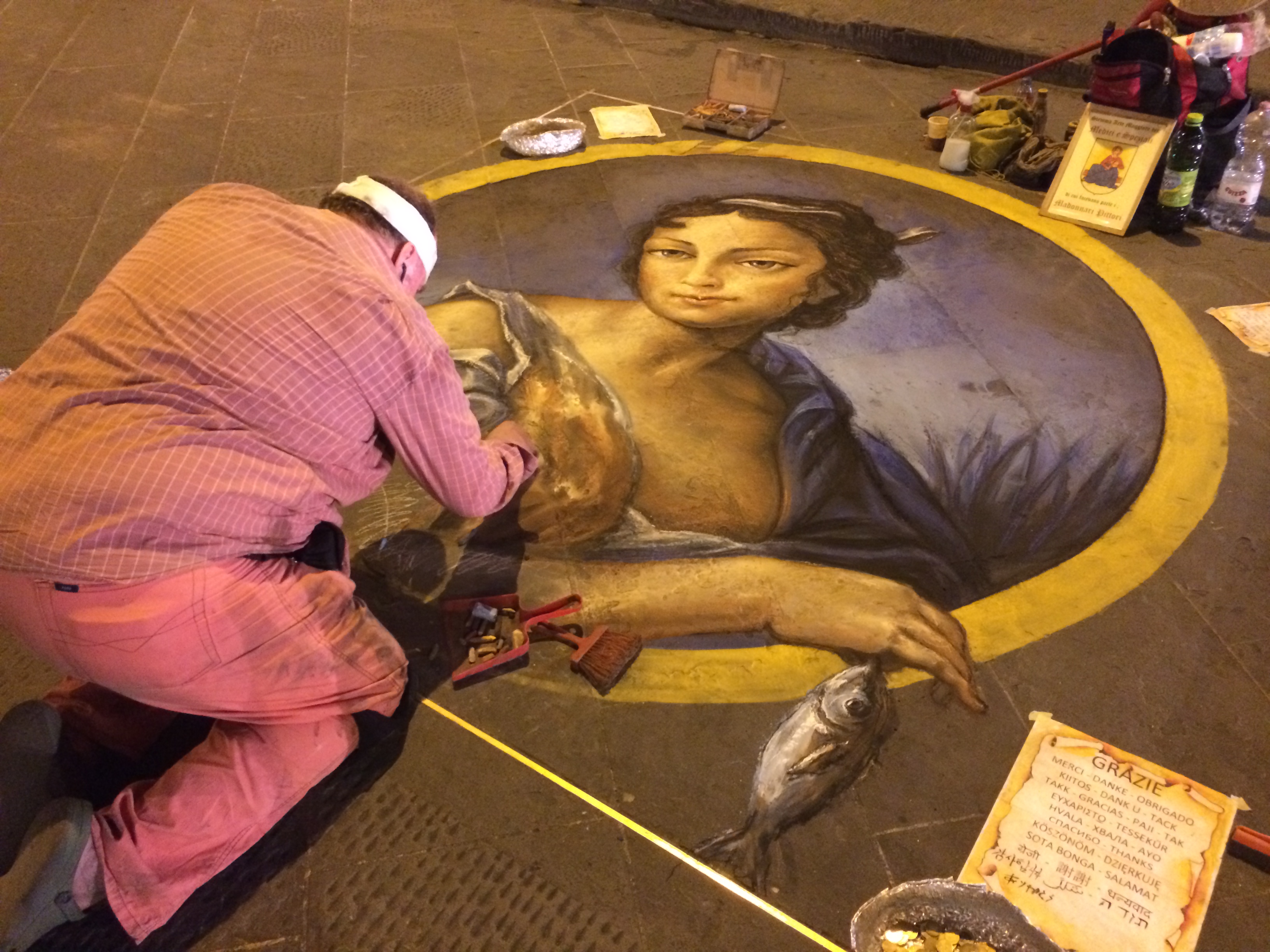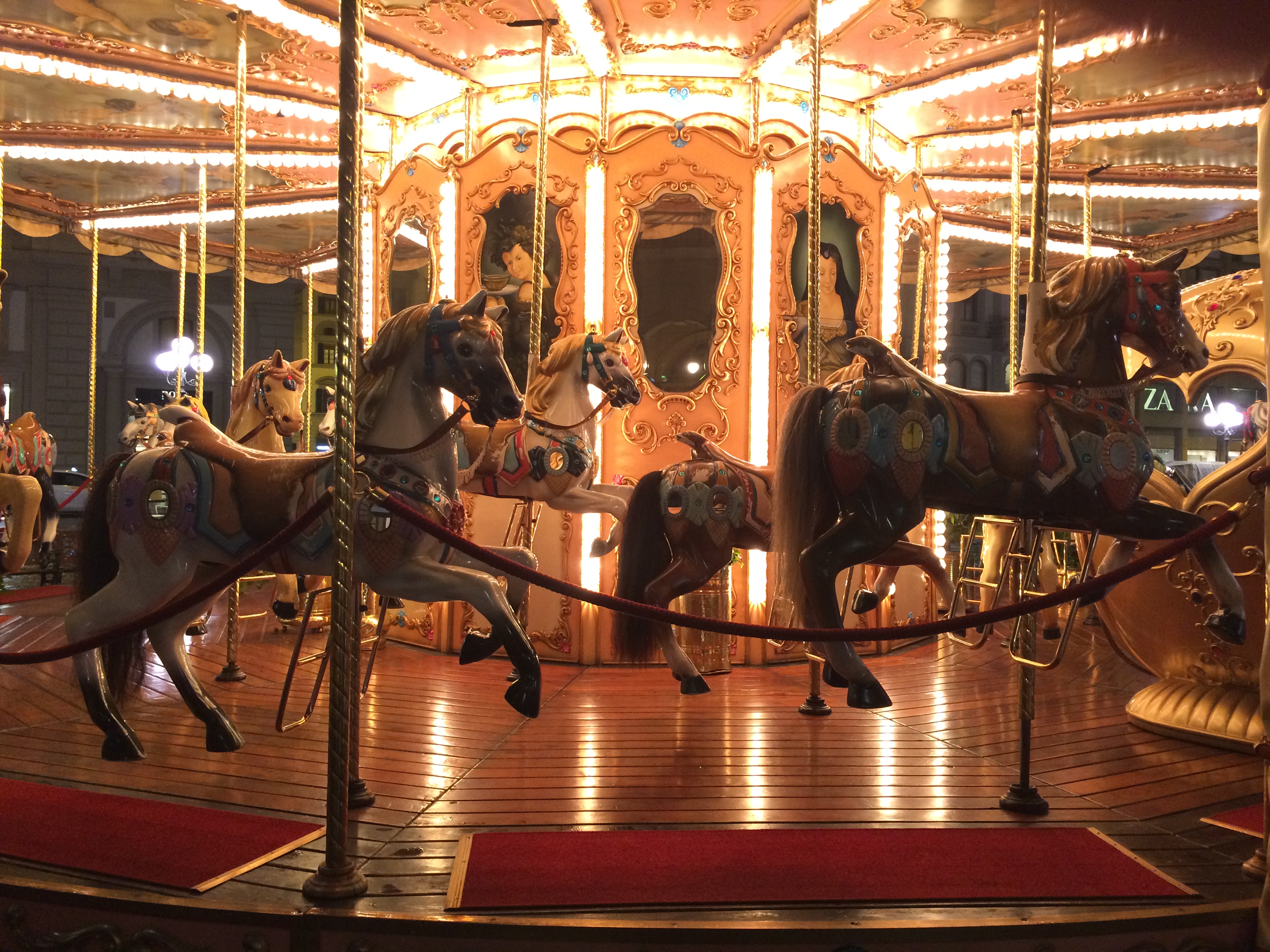 I love that I have walked this city for 3 months and not put a dent in all there is to see here. I have not yet taken pictures of the icons that adorn alcoves in many buildings. I have not begun to find all the shops, churches, museums, and gardens, or explored all the windows, doors, and gates that grace this city. I love the color in the kiosks in Il Porcellino square and outside the Mercato Centrale where shopkeepers sell souvenirs, leather goods, and gorgeous scarves. I love the aroma of the chestnut roaster. I love the beautiful marzipan fruit and pastries that beckon from the windows of patisseries. I love the beautiful fresh flowers available throughout the city at daily street markets. I love the smell of coffee roasting. I love the carousel in the Piazza della Repubblica, the piazzas in front of the Duomo and Santa Croce and the Romanian gypsy string quartet that plays there sometimes. I love that when entering a piazza I might find a street festival going on. I love strolling the Ponte Vecchio in the evenings, listening to street musicians and observing the masterpieces of the chalk artists that will be washed away by midnight, only to be replaced by new works of art, generally copies of the masters, the next day.