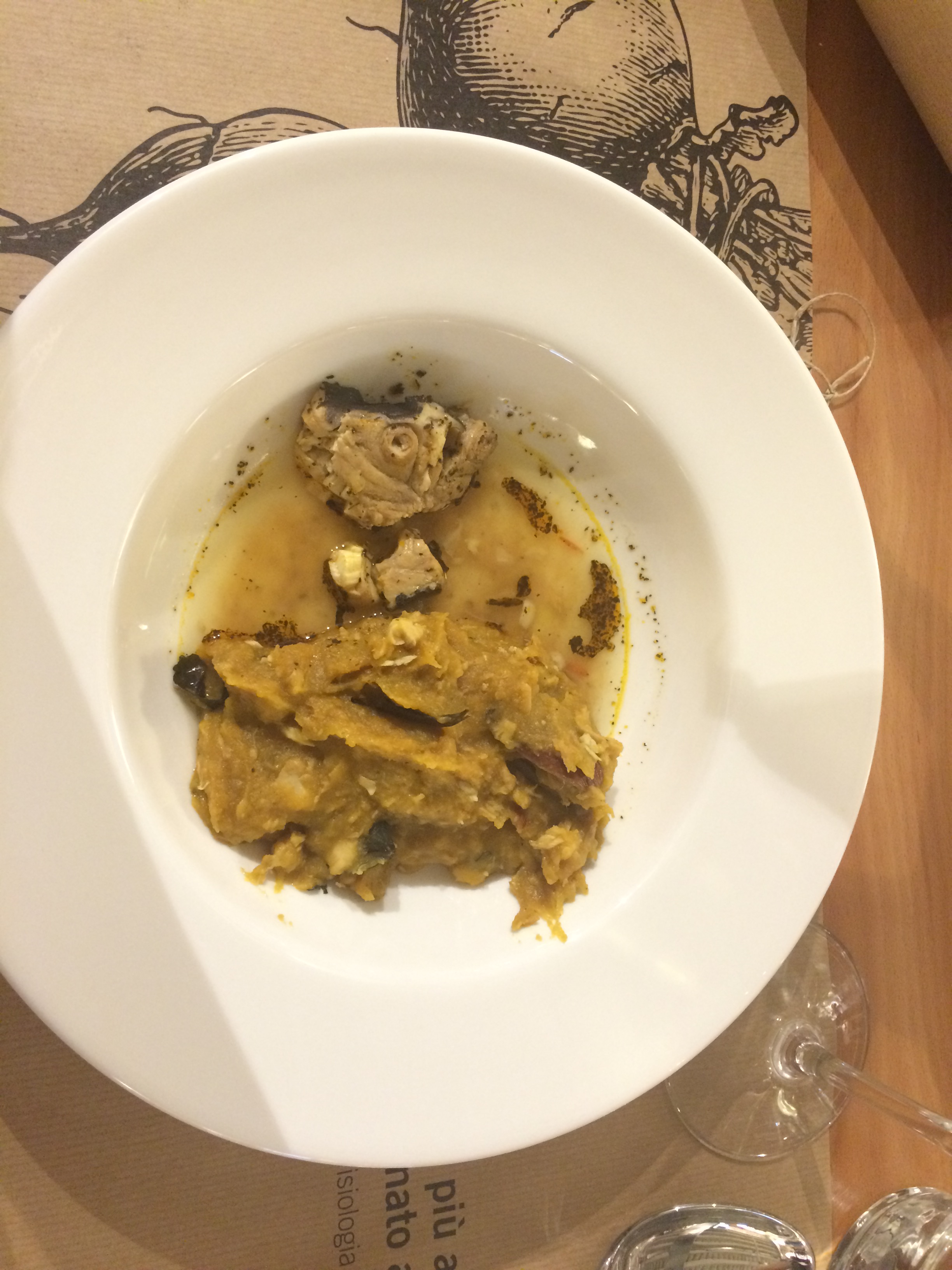 Course #2 – PiRa’o, a spicy cream of mashed cassava with swordfish, a specialty from the island of Sao Tome’ and Principe